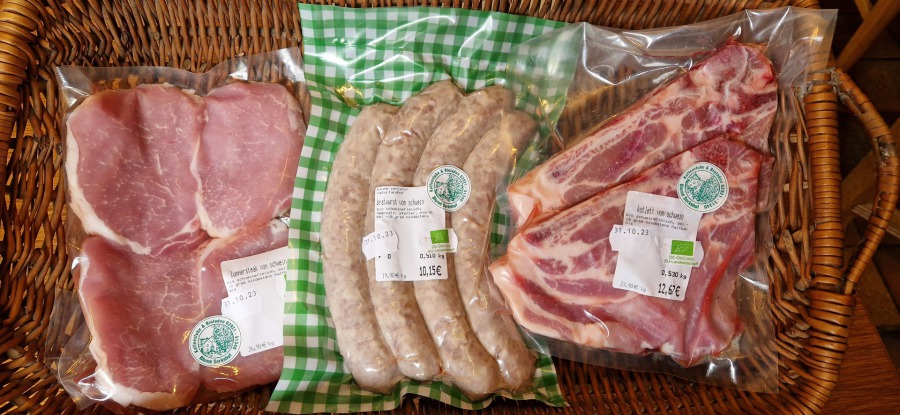Ab sofort haben wir frisches Fleisch vom Bio-Schwein im Angebot; darunter Kotlett, Lummersteak, Nackensteak und Spareribs.